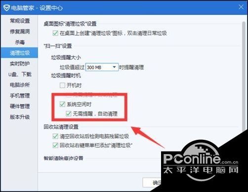 4、将垃圾清理设置里面的清理设置由“开机时”设置为“系统空闲时,无需提醒自动清理”。