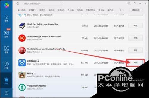 3、找到腾讯电脑管家并点击边上的卸载(这就是腾讯的傻瓜之处:把自己也放在了卸载工具中)。