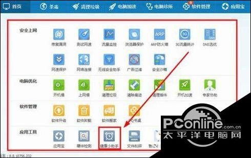 2、点击右下方的“工具箱”,弹出对话框,点击“健康小助手”;
