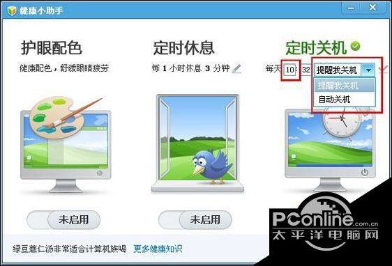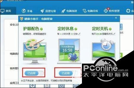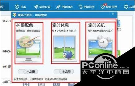 3、弹出对话框,里面有“护眼配色”,“定时休息”,“定时关机”;