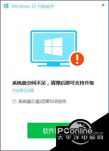 如果检测不通过则会有相应提示;如果系统盘空间不足可通过电脑管家“软件搬家”功能进行扩充空间;