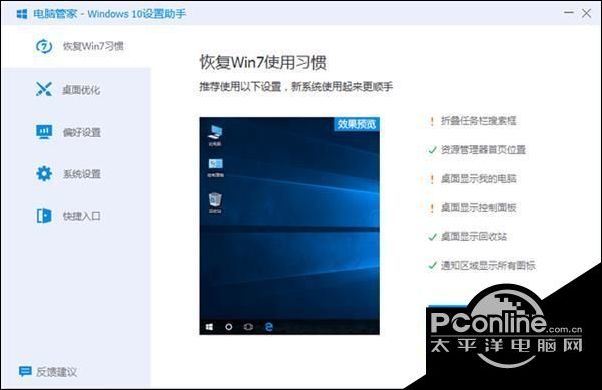 用户安装和升级腾讯电脑管家12.0版本后,可以在“工具箱”一栏找到“Windows10设置助手”,打开设置助手便能看到新版本特意帮助Windows7用户设计的“恢复Win7使用习惯”选项。其中包括折叠任务栏搜索框、桌面显示我的电脑、桌面显示控制面板、通知区域显示所有图标。用户只需点击“快速设置”按钮,电脑立即恢复诸多Windows7特性,不必在内容繁多的Windows设置界面苦苦寻找。