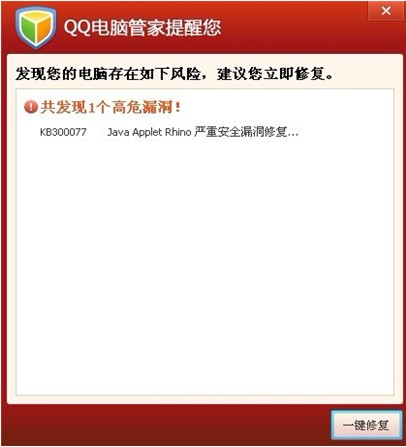 QQ电脑管家产品团队表示,虽然有专家预测,数日内可能爆发利用JAVA漏洞的挂马高峰,但用户也不必恐慌,只需要打开QQ电脑管家,进行漏洞检查并修复,即可安全度过危险期。