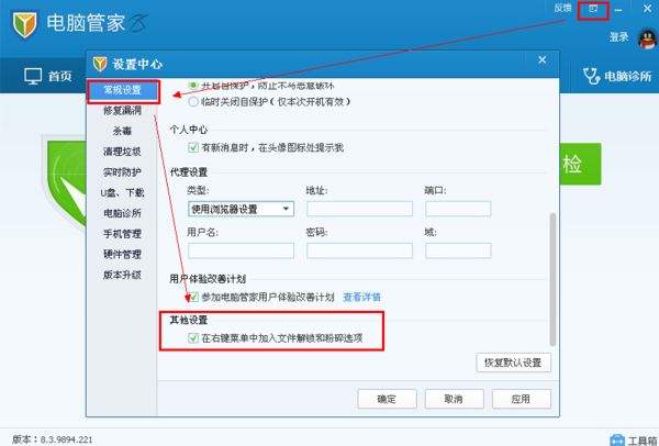 打开腾讯电脑管家——设置中心——常规设置——其它设置,勾选“在右键菜单中加入文件解锁和文件粉碎”即可