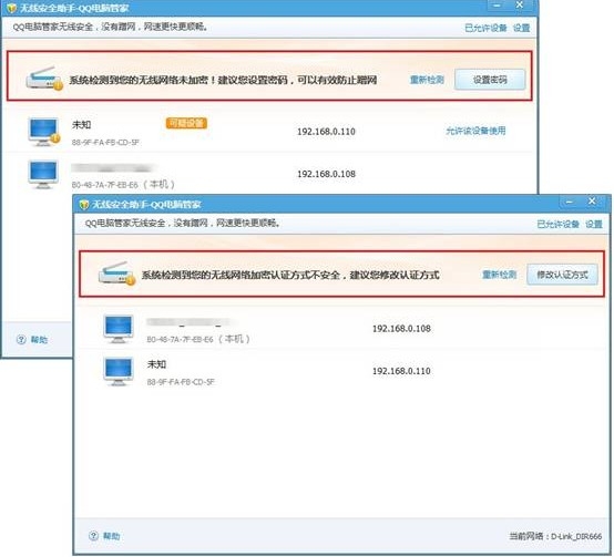 打开“工具箱”在上网栏开启“无线安全助手”,检测当前网络使用情况,检测完成后,界面上会显示出当前正在使用网络的设备信息,包括机器名、 MAC地址以及IP地址等,直观的显示可疑的设备,用户可以选择“允许该设备使用”或者干脆提醒设置加密,对于加密方式不安全仍具有安全隐患的情况,QQ 电脑管家则会提醒用户“修改认证方式”,并引导教育用户修改设置加密方式,拒绝被蹭网,让网速更快更顺畅!(图1)