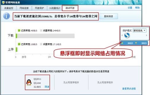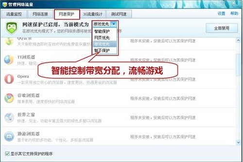 用户在QQ电脑管家主页的“工具箱”中选择“管理网络流量”功能,点击“网速保护”标签,并开启网速保护模式,在下拉框中选择“游戏优先”的模 式,就能够实现智能控制带宽分配,保证游戏进程流畅,同时分配多余流量到其他后台执行的项目;当然,用户也可以根据需要选择“智能保护”和“网页优先”的 模式来配合不同的操作进程。(图2)