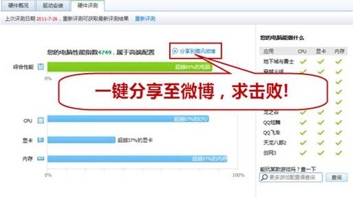 晒包包、晒签名、晒和老爸老妈的聊天记录?你OUT啦,现在最流行晒电脑配置!在这个分享为王,娱乐至上的年代,将电脑硬件评分分享到微博上也 成为一种潮流!QQ电脑管家新增硬件评测分享功能,可以将硬件评测结果一键分享至腾讯微博,用数字说话证明爱机的“实力”!在QQ电脑管家5.3 Beta1“硬件检测”中选择“硬件评测”可获取到电脑的详细评分参数和性能指数,点击“分享到腾讯微博”就能将评分结果分享给好友了!还不快试试?(图 4)