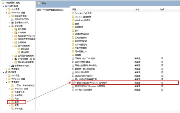 2、看下“系统——不要运行指定的windows应用程序”,默认的是否是“未配置”状态