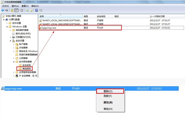 4、除上述之外,在“软件限制策略——其他规则”中,看看管家路径的安全级别,如果是“不允许”的状态,右键删除即可