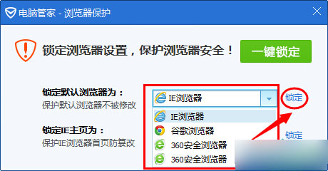 3.在锁定默认浏览中选择要设置成默认的浏览器,然后点锁定即可。