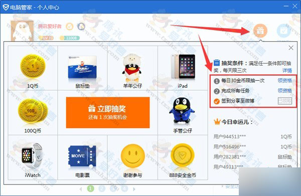 再点击右边的抽奖便可,每天完成电脑管家简单任务可以抽奖3次