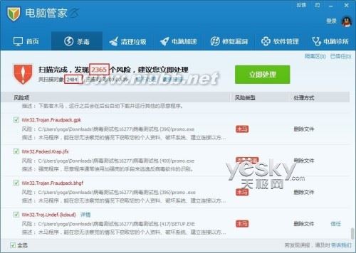 39秒之后,病毒扫描完成,腾讯电脑管家8.0给出扫描结果:共扫描对象2484,发现2365个风险,建议立即处理。我们可以仔细查看每一个风险项的具体风险信息和描述以及相关的文件,如果有自己确认不属于风险项的文件,可以取消勾选,确认完毕之后,点选“立即处理”绿色按钮,腾讯电脑管家8.0即可将所选风险项一一处理干净。