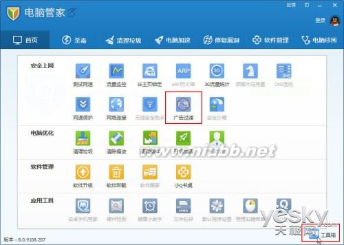 图示:腾讯电脑管家8.0“工具箱”分类更清晰 提供广告过滤