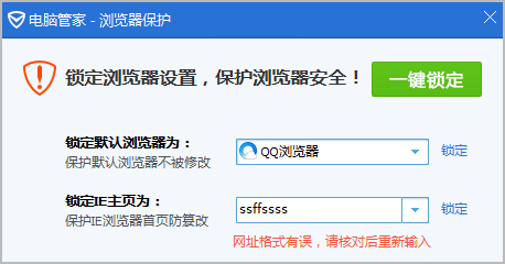 浏览器保护功能可以为您锁定和保护您在使用浏览器时最为习惯和常用的主页网站,不会被其他程序自动恶意篡改,保护您的上网安全和便利。您可以从电脑管家的工具箱中进入浏览器保护功能。