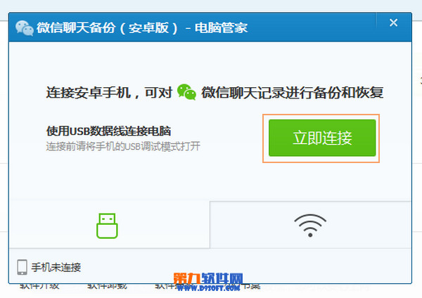 打开“微信聊天备份”工具后,用户把手机连接到电脑,手机连接电脑方式可以通过数据线或者wifi。