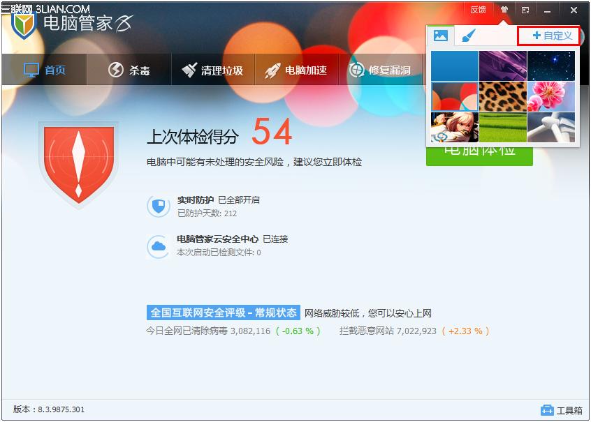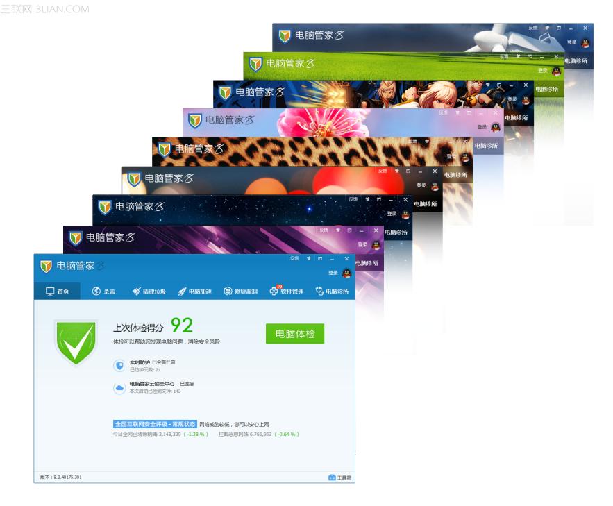 电脑管家特别精选了8张皮肤,这8张皮肤主题分别为草地、宇宙、光斑、风车、鲜花、科技、游戏和豹纹,每种皮肤主题都有一个诗情画意的名字。有兴趣的朋友快来体验吧!
