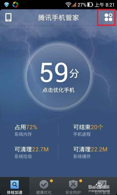 [腾讯手机安全管家]腾讯手机管家QQ安全有什么作用——详细方法步骤[腾讯手机安全管家]腾讯手机管家QQ安全有什么作用 一打开腾讯手机管家的首页,点击右上角的四叶草图标,打开工具选项,左上角那个是设置,不要点错了,点开之后,就可以看到它附带的实用工具了