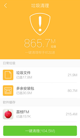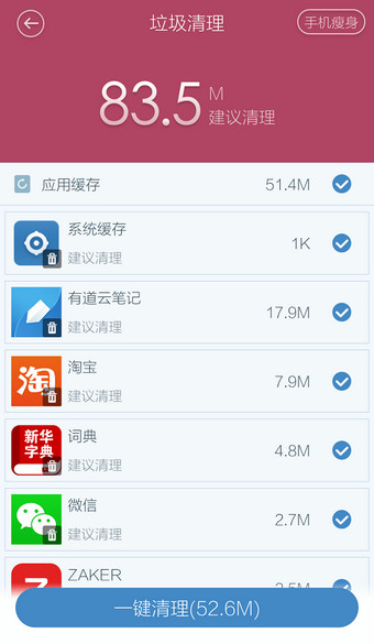 当手机使用一段时间后,系统和APP产生的垃圾会占用相当一部分手机空间,及时清理就有必要了。清理之后,百度手机卫士是首先呈现APP产生的垃圾,而后才是其他类型的垃圾;而腾讯手机管家则相反,先把垃圾归类,下面才是APP垃圾。