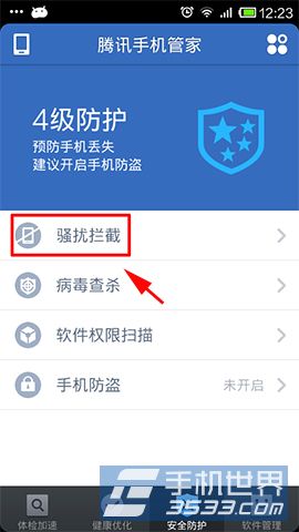 1)打开腾讯手机管家,点击安全防护,再点击骚扰拦截;