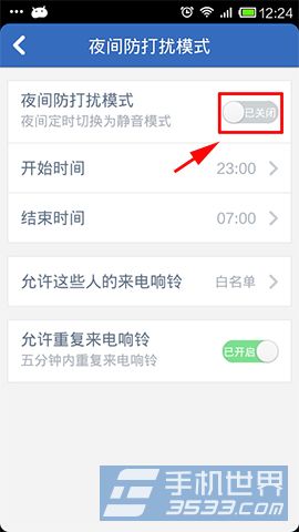 3)此时夜间防打扰模式是关闭的,点击开启,可以设置开始时间和结束时间;
