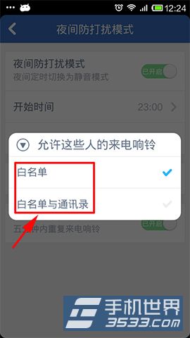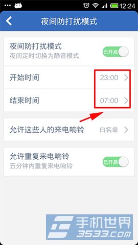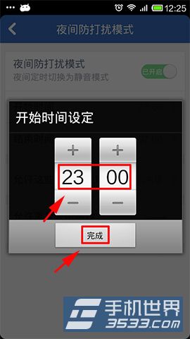 4)开始时间和结束时间设定,很简单,如点击开始时间,出现开始时间设定,向上+或向下-时间,设定好时间后点击完成即可。允许这些的来电响铃,指设置的白名单或者白名单与通讯录的人的来电会响铃。除此之外万一人家要是有紧急的事情来电,所以该软件自动设置好五分钟内重复来电响铃的功能。