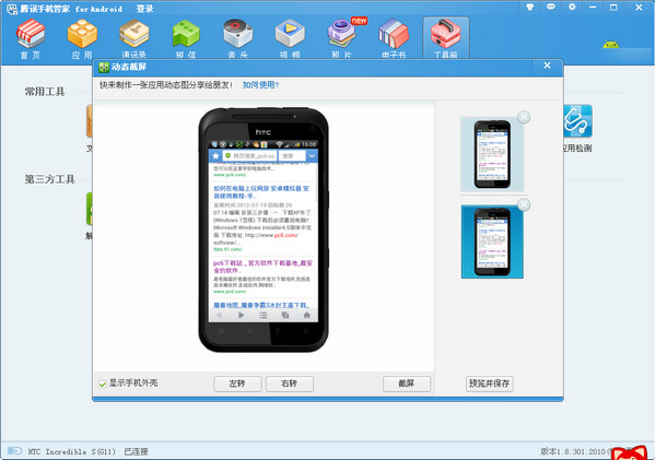 最近迷上了腾讯的手机管家,发现里面有一个很好玩的一个工具,就是手机截动态图。手机上面的截图软件比较多,但貌似还没发现有截动态图的软件,当然,这个软件也是PC端的手机管家才能实现,而且只能是手机屏幕的动态截图。