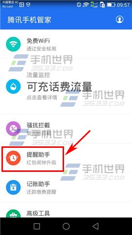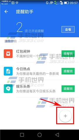 1)点开腾讯手机管家,首先下拉主界面,点击【提醒助手】,随后再点击箭头所指处的【+】按钮;(如下图)