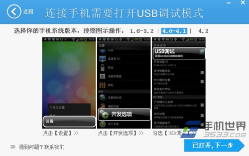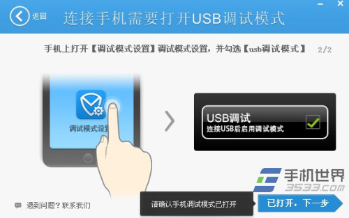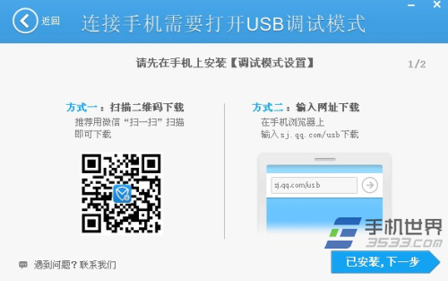 点击快速打开后出现两种方式安装调试模式设置:一、可通过扫描二维码下载;二在手机浏览器上输入网址。已安装好的可点击下一步。(这一点大部分安卓手机已经帮你安装好USB调试模式,所以尽管放心的点下一步吧!)