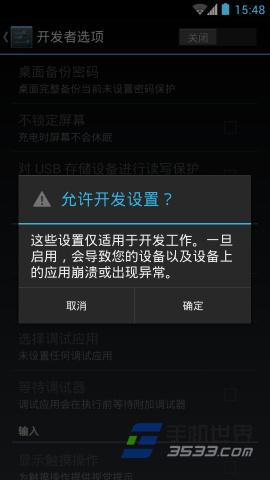 这时就需要在手机上打开调试设置,勾选USB调试,然后点击确定