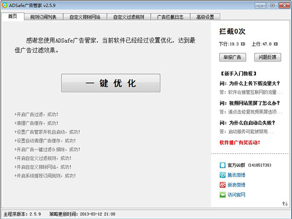 ADSafe运行后,单击右下角托盘图标,弹出界面如下。在“首页”选项卡,点击“一键设置广告过滤”按钮,ADSafe即可达到最佳广告过滤效果。如下图所示: