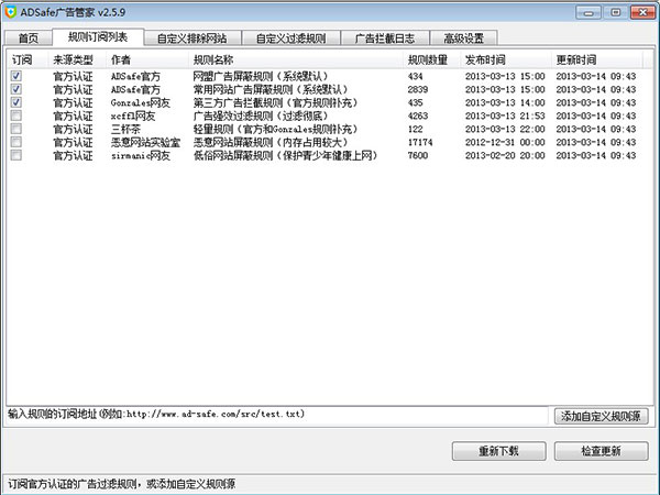 ADSafe 的一键设置广告过滤功能,适用大多数用户,此外,ADSafe 还提供个性化设置满足高端用户需求。规则订阅列表