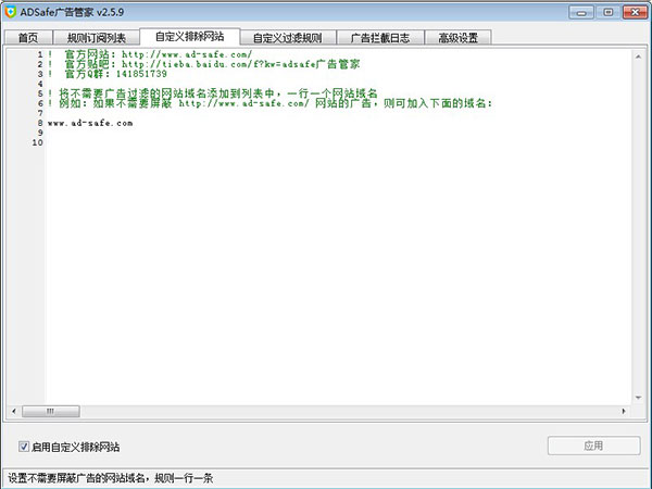 大多数过滤广告产品存在误杀现象,如果怀疑某网站被ADSafe误杀,可尝试将该网站主域名放入“自定义排除网站”选项卡里,并点击“应用”,如下图所示: