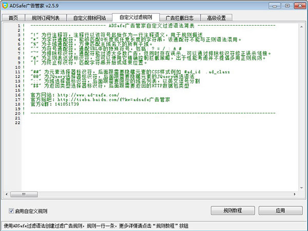 ADSafe 提供自定义规则语法,将编写好的规则语法放到此处,即可过滤广告,如下图所示: