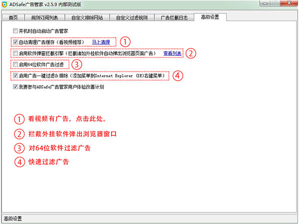 广告拦截日志,可以查看ADSafe 具体拦截了哪些内容。高级设置