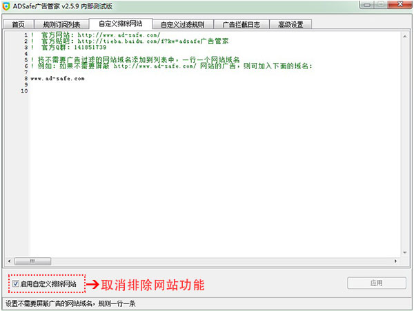大多数过滤广告产品存在误杀现象,如果怀疑某网站被ADSafe误杀,可尝试将该网站主域名放入“自定义排除网站”选项卡里,并点击“应用”,如下图所示: