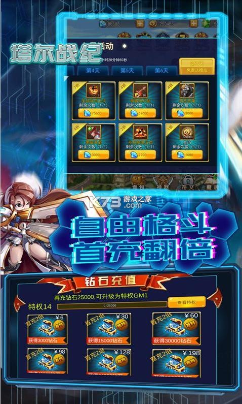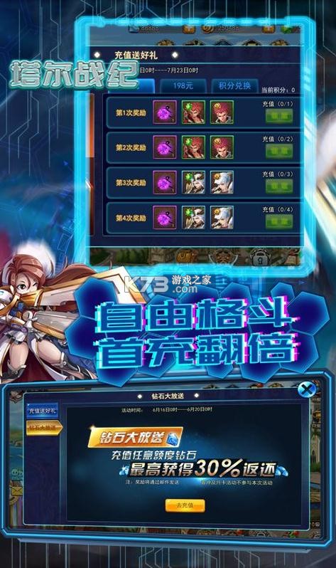 《塔尔战记》在这里拥有多样的高度的战斗,公会掠夺开启对决,击败恶魔来保护自己的城堡,充值任意的金额获得百分之30%的返还,充值元宝返利多,充值还有好礼,福利多多,每日福利超级多,魅力无限。