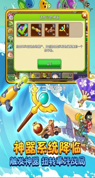潘妮在时空隧道的深处发现了一些强力的神器,神风神器、闪电神器、投罐神器、治愈神器已经上线,为大家的战场带来了更多的可能性。神器具备主动技能和被动增益,随着神器等级的增加,他们也将会拥有更加有用的技能和属性提升,为植物们带来增益效果。更多神器即将在未来和大家见面,为战场带来强有力的支持,敬请期待哟!