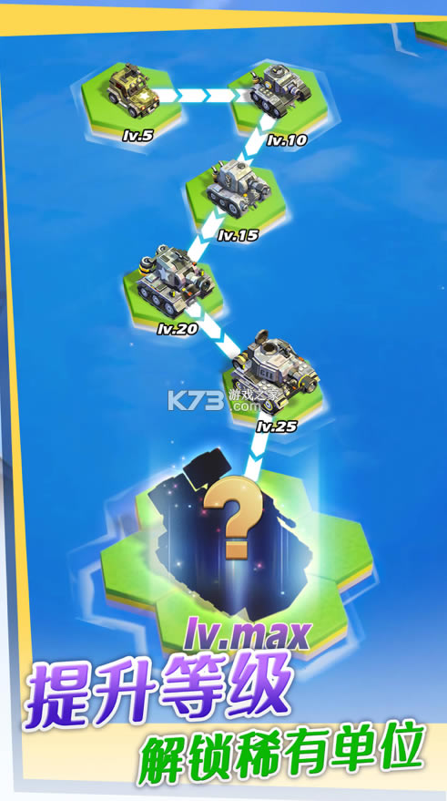 玩家将首先建造低级建筑或兵种,并通过拖动2个相同等级的单位融合递升一级,之后还会开启多个同级别单位快速合成的新模式。