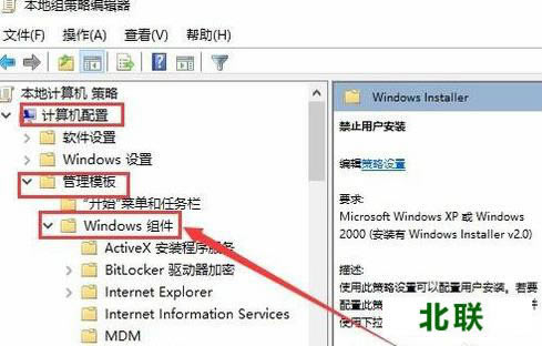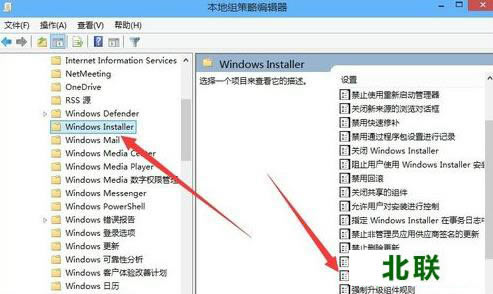 五、 在打开的Windows组件菜单项中找到“Windows Installer”菜单项,在右侧找到“禁止用户安装”一项。