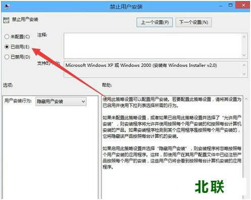 六、 双击可打开“禁止用户安装”的编辑窗口,可以看到该项设置为“已启用”,这就是导致不能正常安装软件的原因。