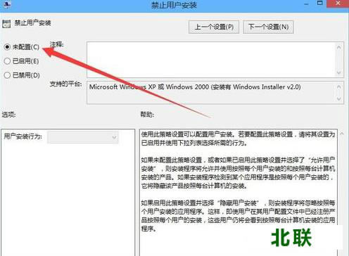 七、 我们把该项设置为“未配置”或是“已禁用”,然后点击确定按钮保存退出,这样以后就可以正常安装软件了。