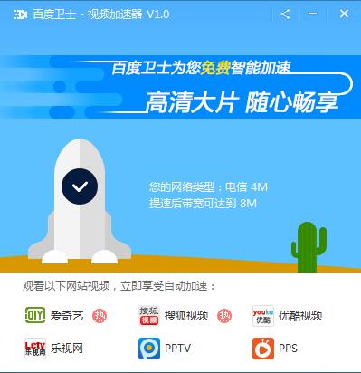 百度卫士视频加速器是一款免费的在线视频加速工具,2M网速最高提速到20M,光纤最高提速到100M!智能自动加速,简单好用!