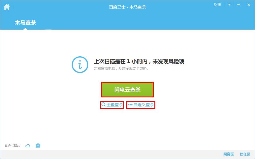 百度卫士软件有“闪电云查杀”、“全盘查杀”、“自定义查杀”三种病毒查杀模式,您可以选择您需要的模式进行病毒查杀。
