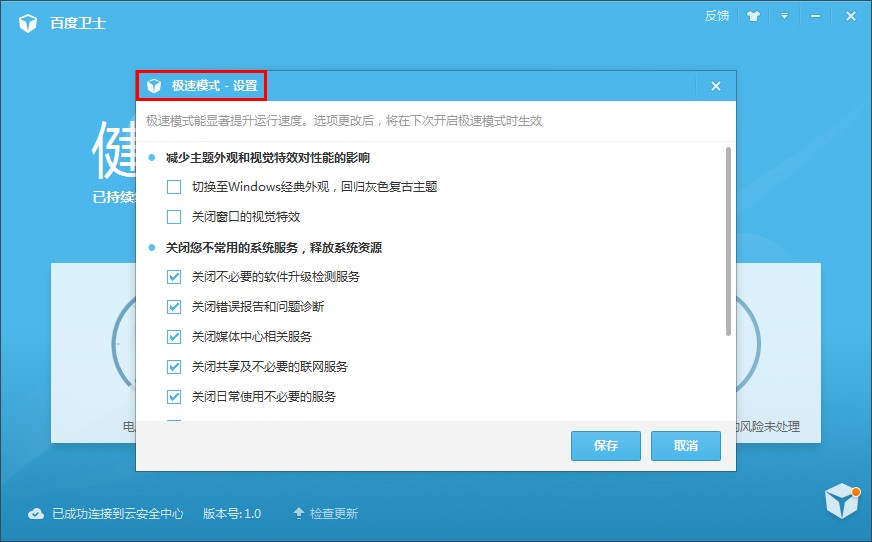 点击旁边的设置图标,可进入”极速“模式的设置界面,可以设置极速模式的优化项目。