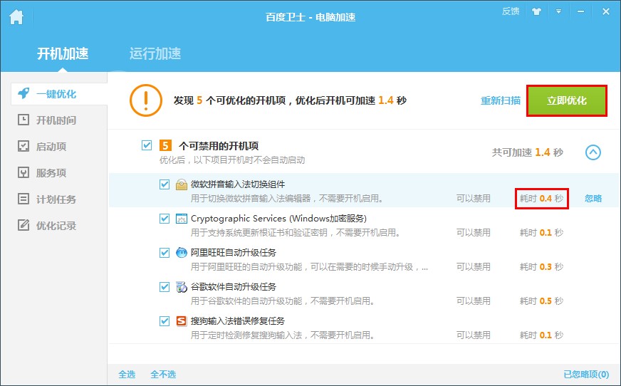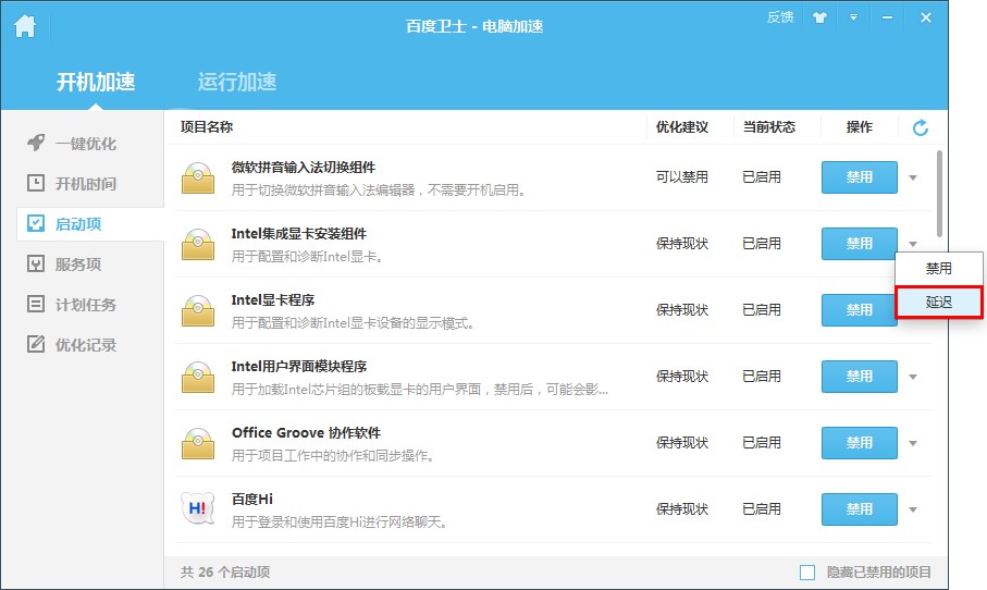 开机加速:通过“一键优化”和手动禁用或延迟启用开机项达到开机加速的效果,节省系统开机过程的等待时间。