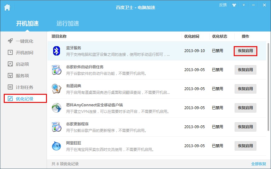 如果您想撤回已优化项,比如您对一键优化开机加速的优化结果不满意,或者一键优化禁用了您不希望禁用的开机项等,请点击左侧菜单栏中的“优化记录”,切换至优化记录列表,通过点击“恢复启用”操作便可恢复相应的已优化项。