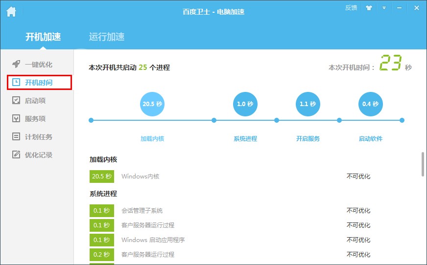 百度卫士在开机加速中提供了“开机时间”功能,真实生动的还原电脑开机过程。根据启动时间排序,清晰展现每个开机阶段,并能了解各开机项的启动顺序及在开机过程中占用的时间。