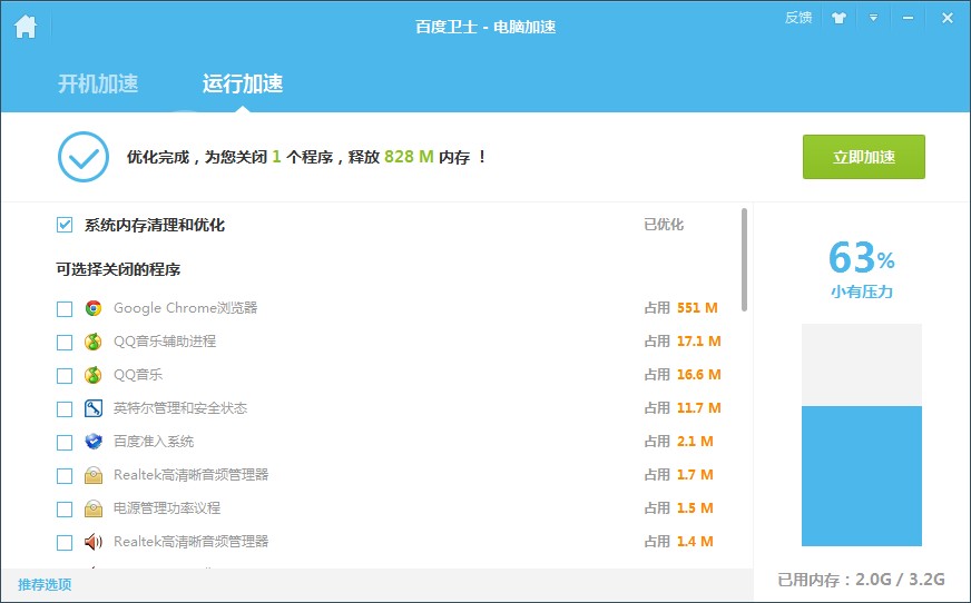针对用户在上网、打游戏、看视频时常见的电脑卡、慢的问题,百度卫士推出了运行加速功能。运行加速一键帮您关闭系统中正在运行的不需要的程序和后台服务,释放系统内存,立竿见影地提高系统运行速度。