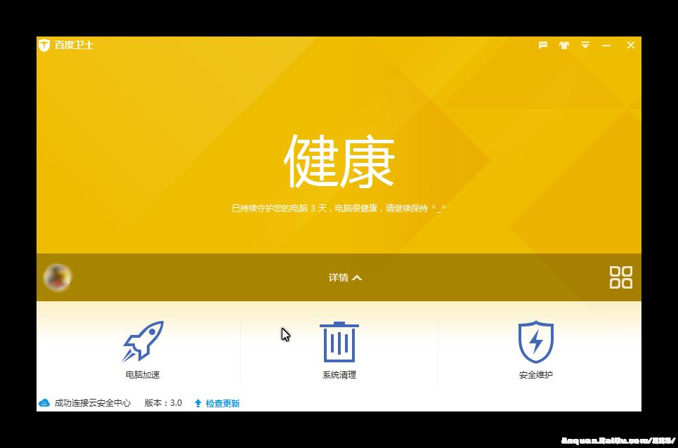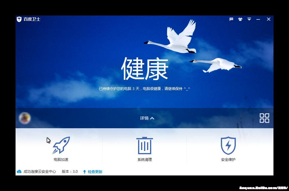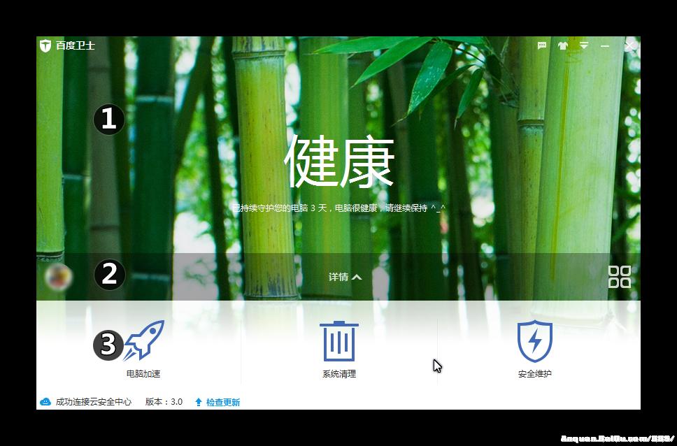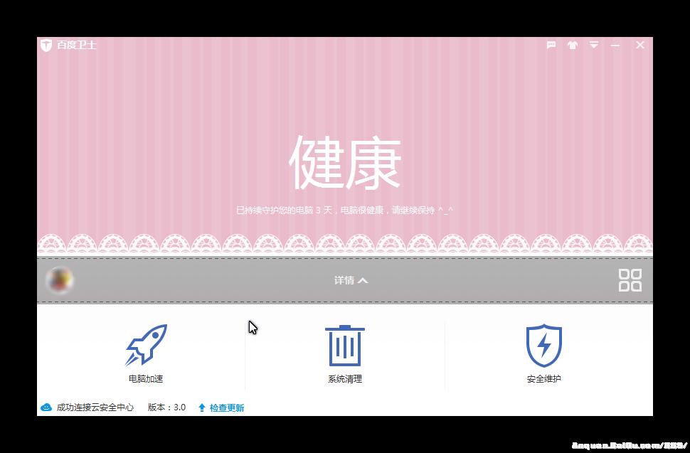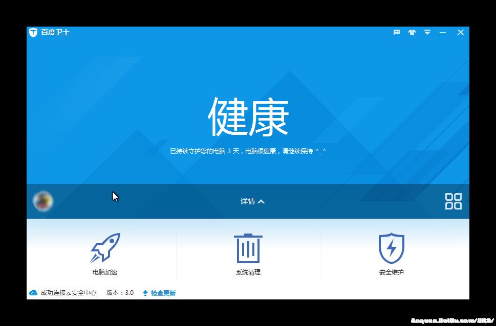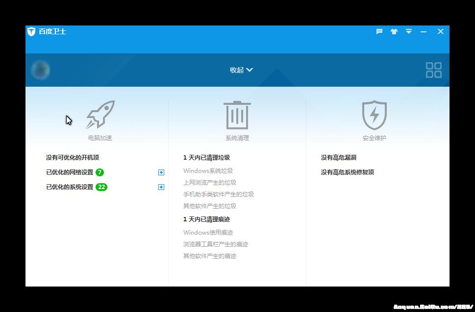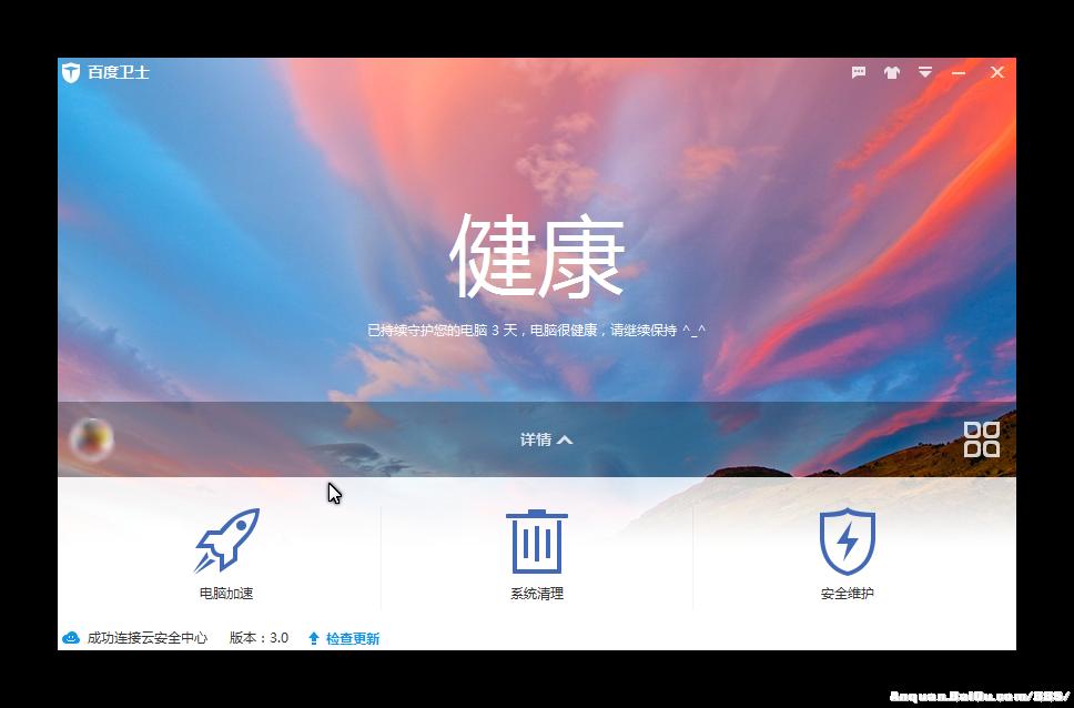 百度卫士3.0摒弃了以往同类产品按钮丰富,左右布局的风格,取而代之的是大面积的状态展示模块与上下垂直布局的风格,整个主页面只有3块,更加简洁,也更容易为一些视力不佳或者中老年人所使用,不可谓设计用心。