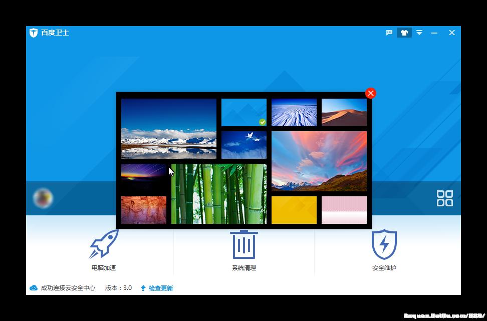 现今,各种软件都流行换肤,用户可以通过这类功能打造符合自己喜好风格的软件,百度卫士3.0当然也不会落下这个功能。百度卫士3.0贴心的为大家提供了许多优秀的壁纸,方便大家挑选,可惜的是暂时还不支持自定义。